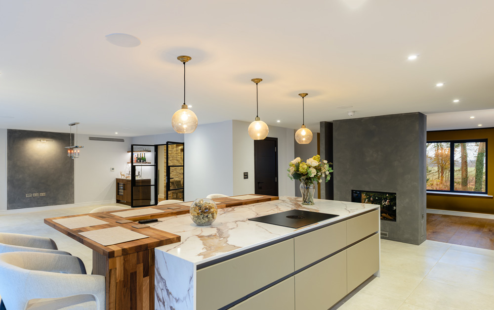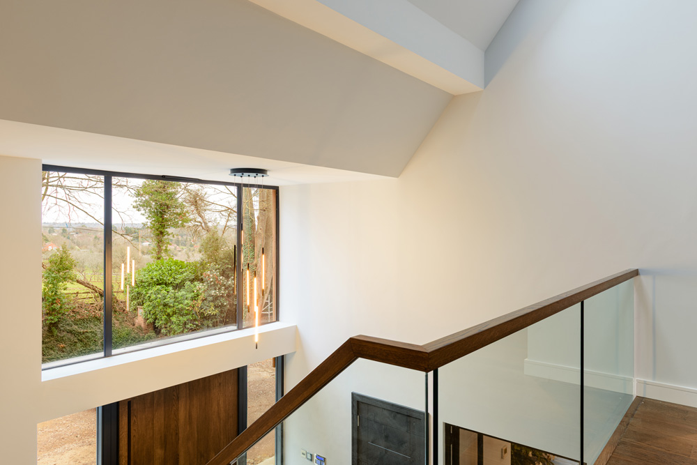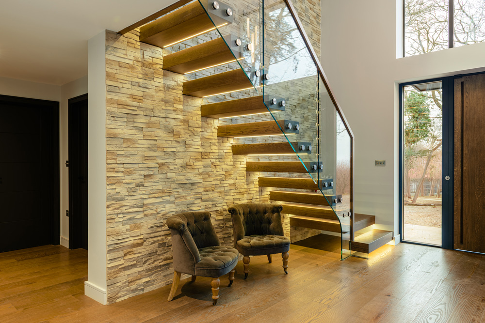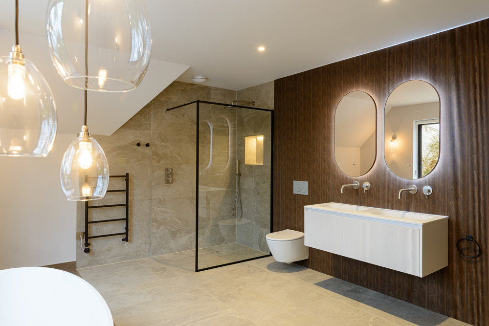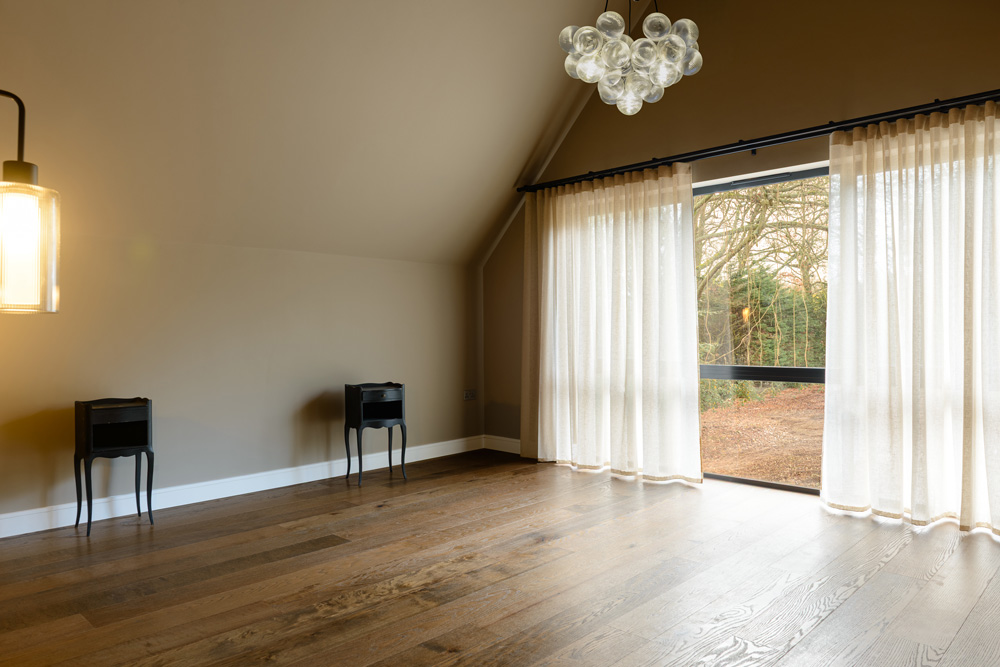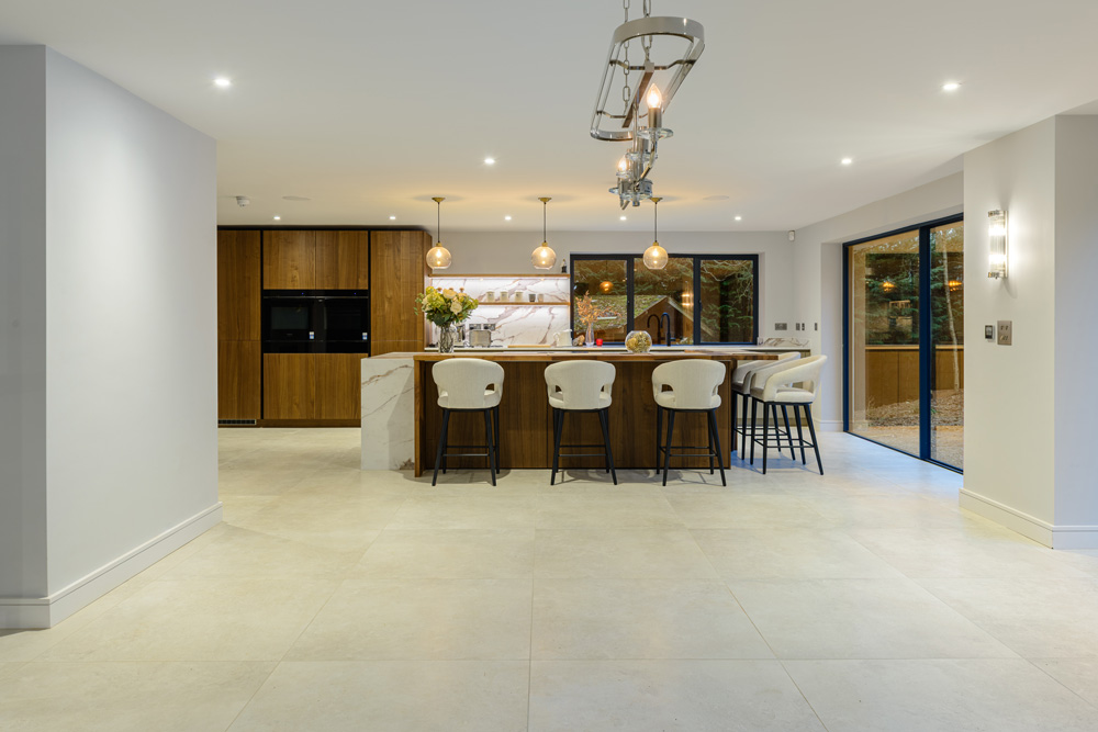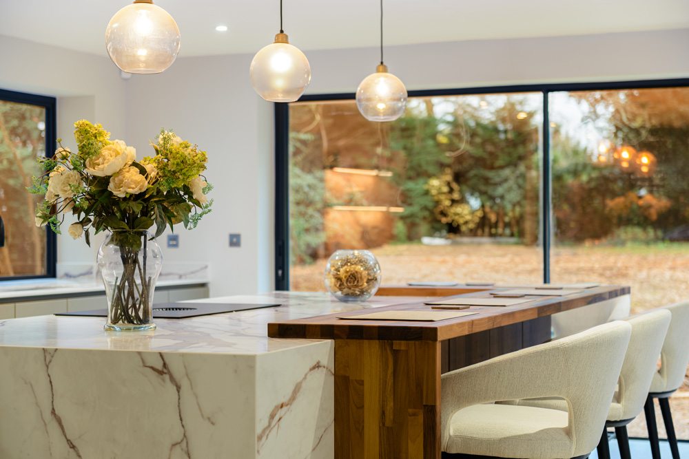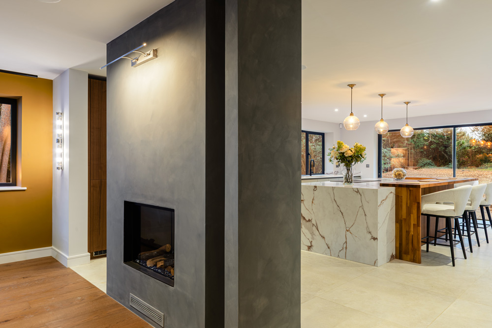 Bungalow renovation at Materials in Harmony transformed a dated bungalow into a completely reimagined family home. The existing roof was removed and replaced with a new timber frame first floor and trussed roof, creating a fresh layout and a much stronger architectural presence. The exterior features a combination of microcement columns, warm timber cladding, silicone-based render, brick slips, and aluminium windows. This blend of materials and textures creates a bold façade and gives the property strong kerb appeal.