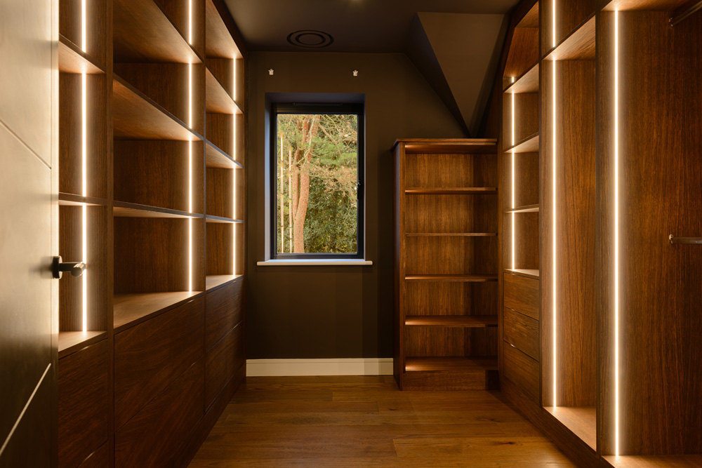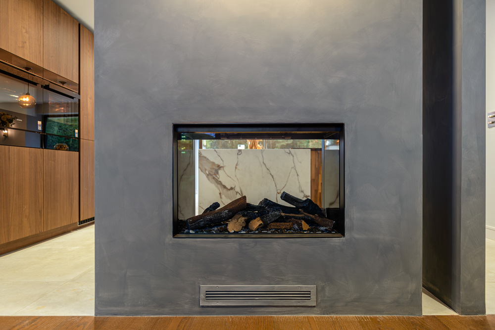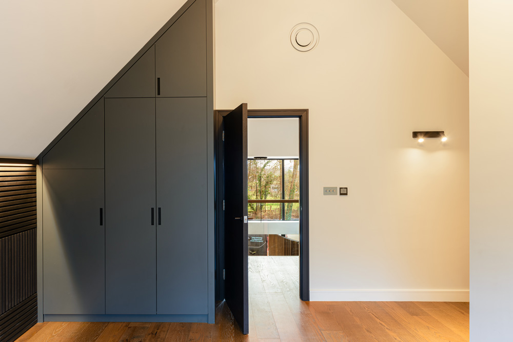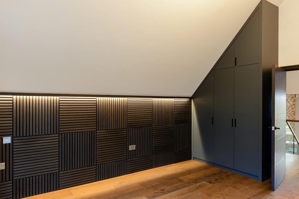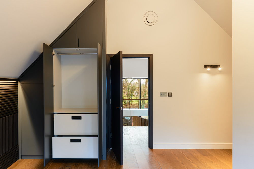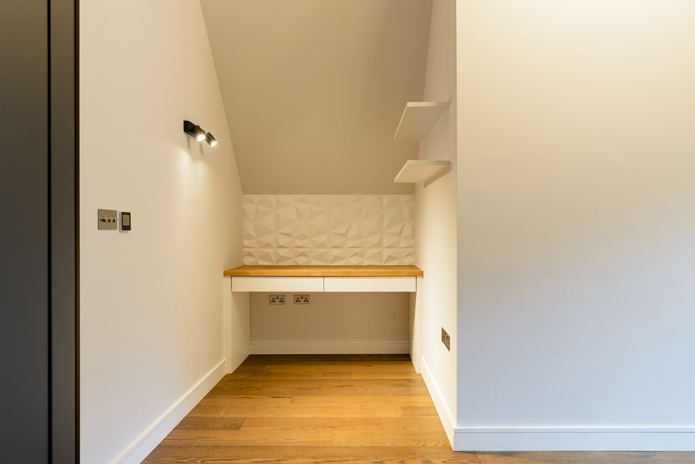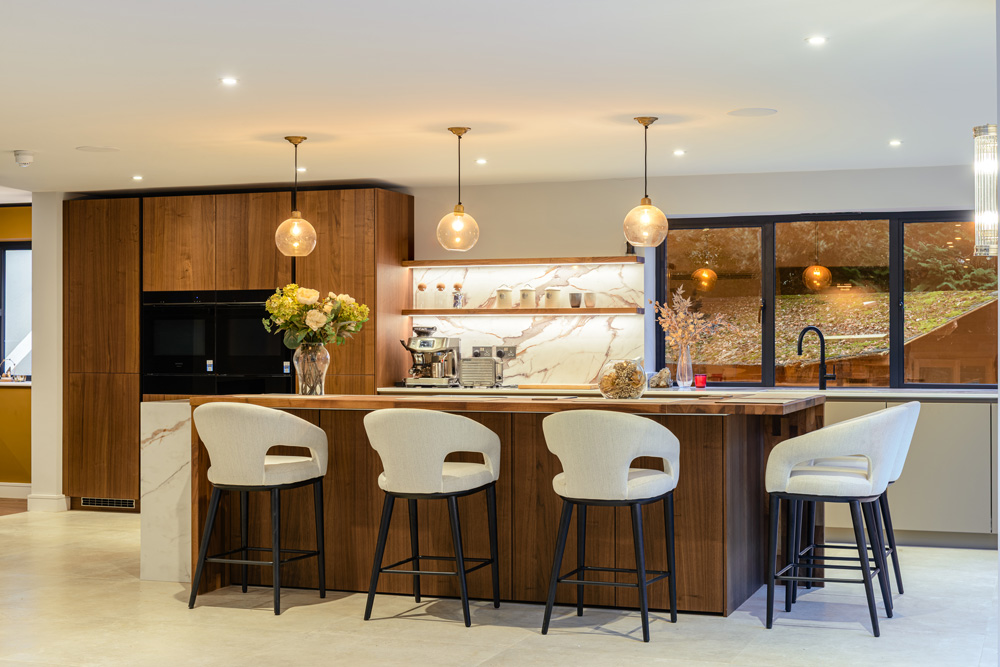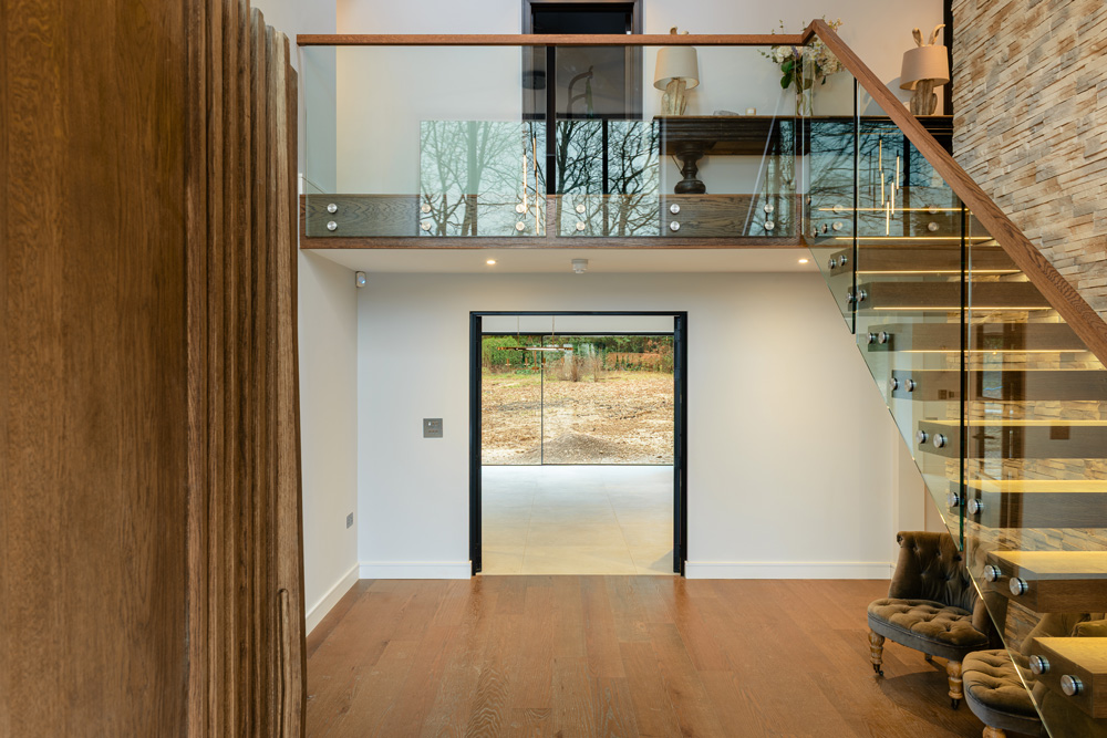 Bungalow renovation at Materials in Harmony transformed a dated bungalow into a completely reimagined family home. The existing roof was removed and replaced with a new timber frame first floor and trussed roof, creating a fresh layout and a much stronger architectural presence. The exterior features a combination of microcement columns, warm timber cladding, silicone-based render, brick slips, and aluminium windows. This blend of materials and textures creates a bold façade and gives the property strong kerb appeal.