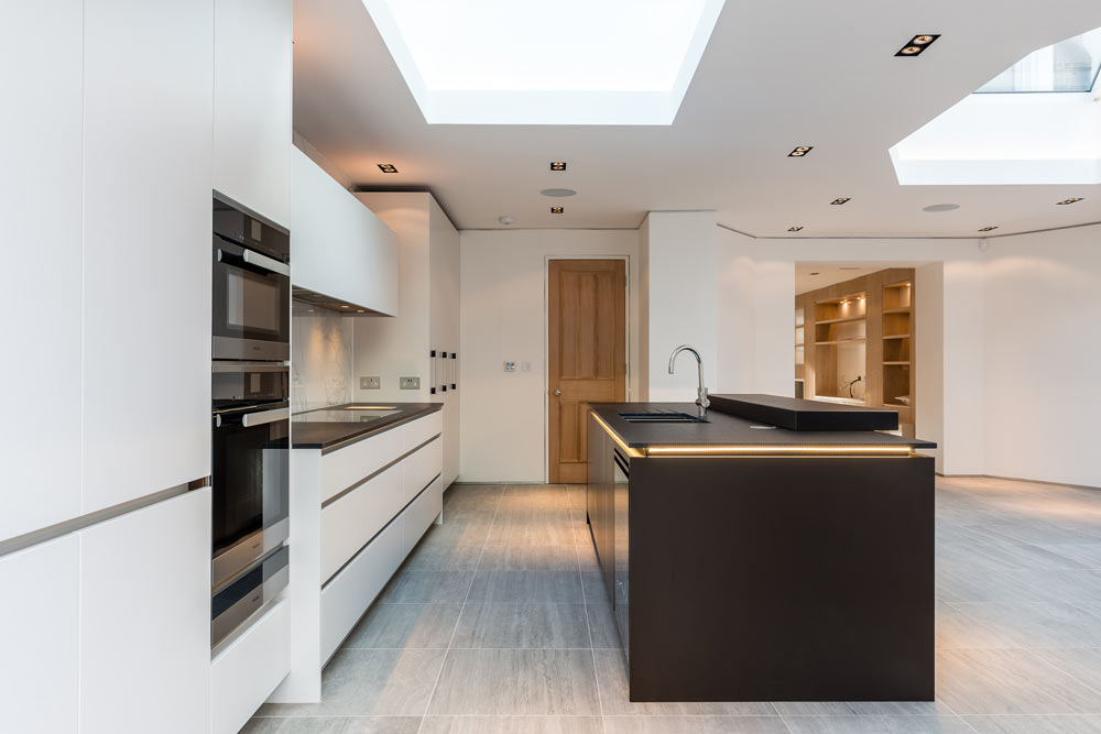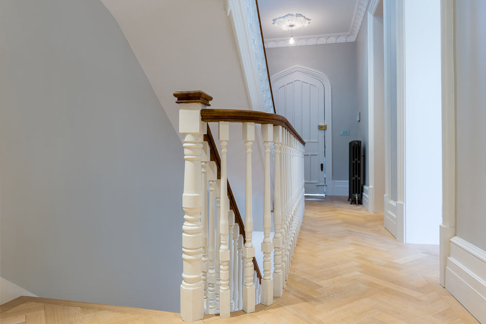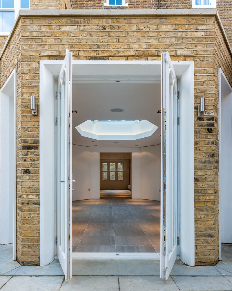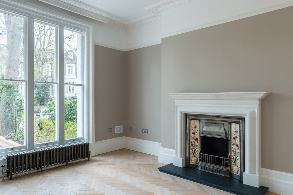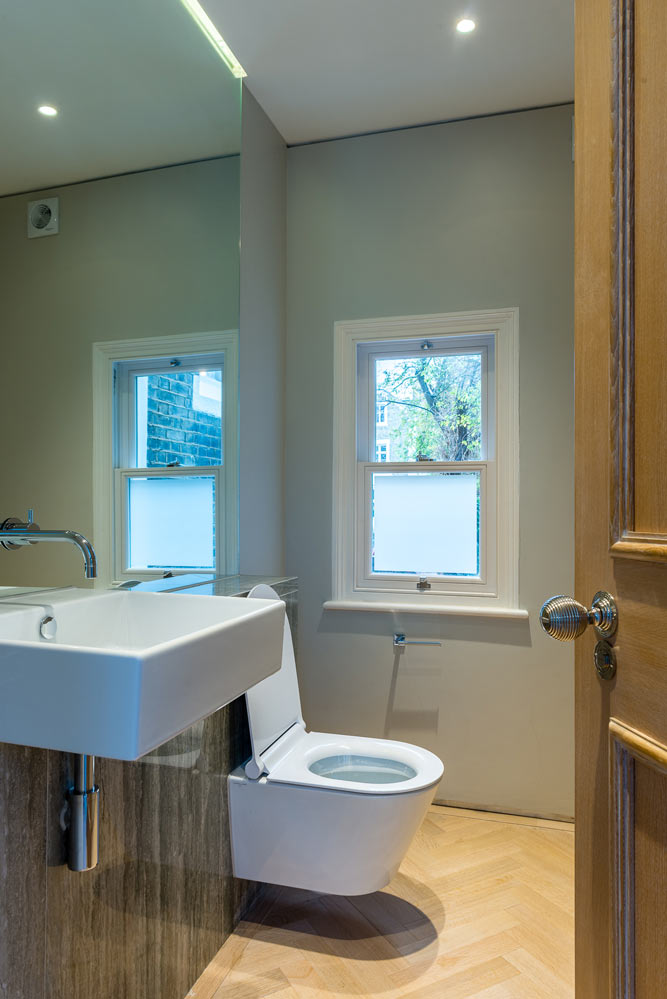 Full house refurb including four-storey extension and basement excavation. Modern basement but traditional features elsewhere.