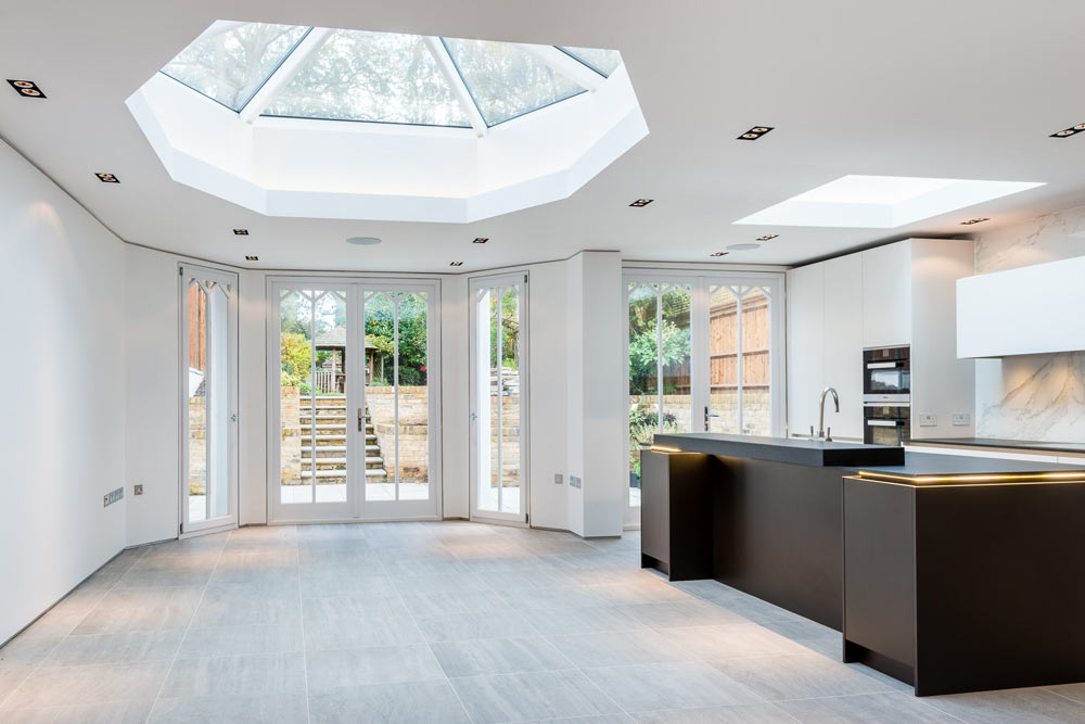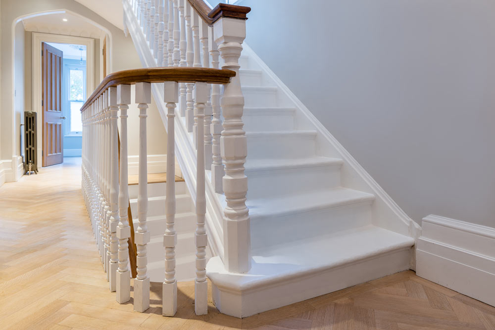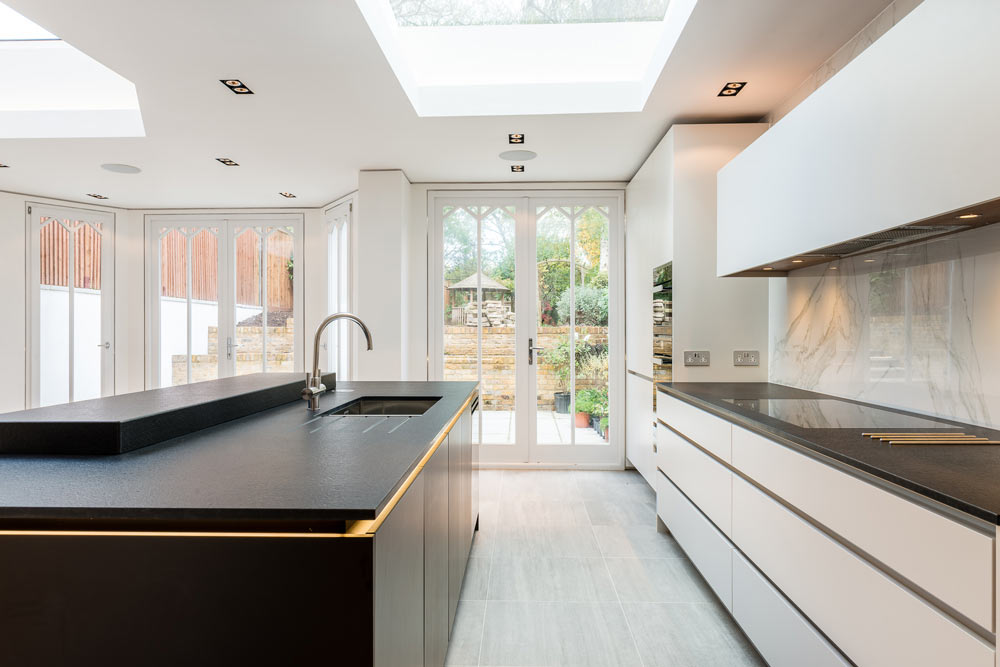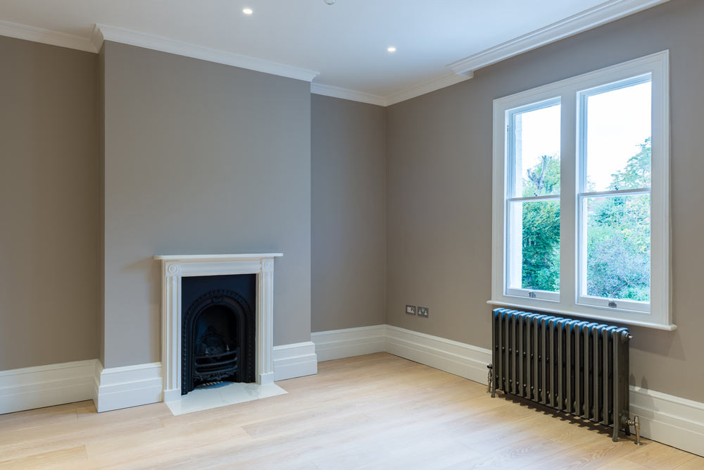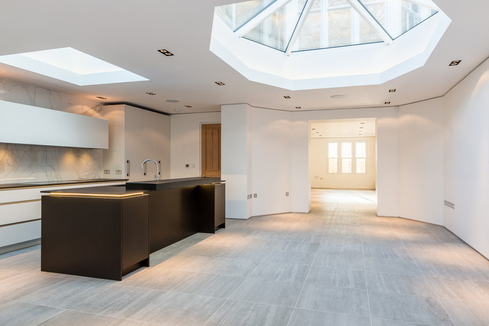 Full house refurb including four-storey extension and basement excavation. Modern basement but traditional features elsewhere.